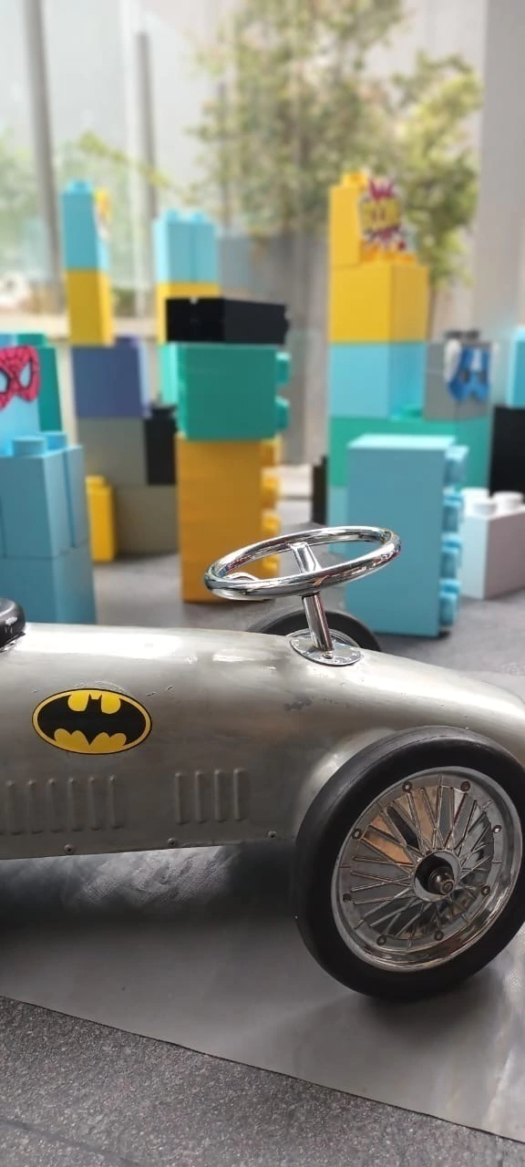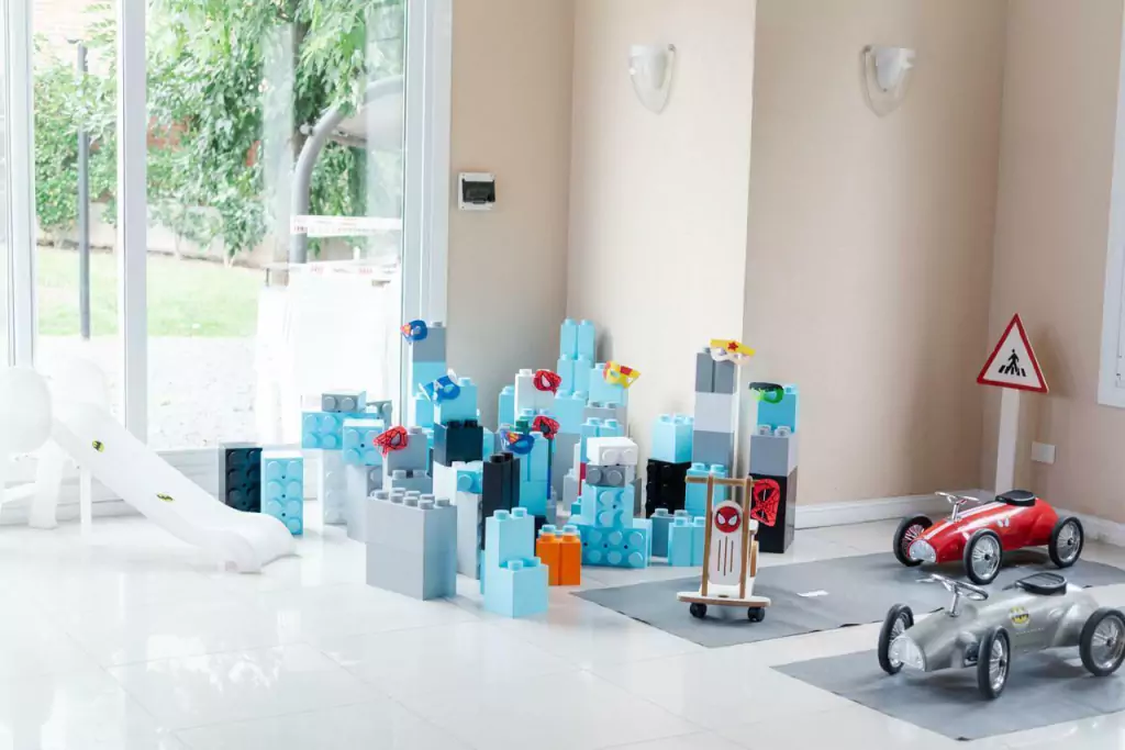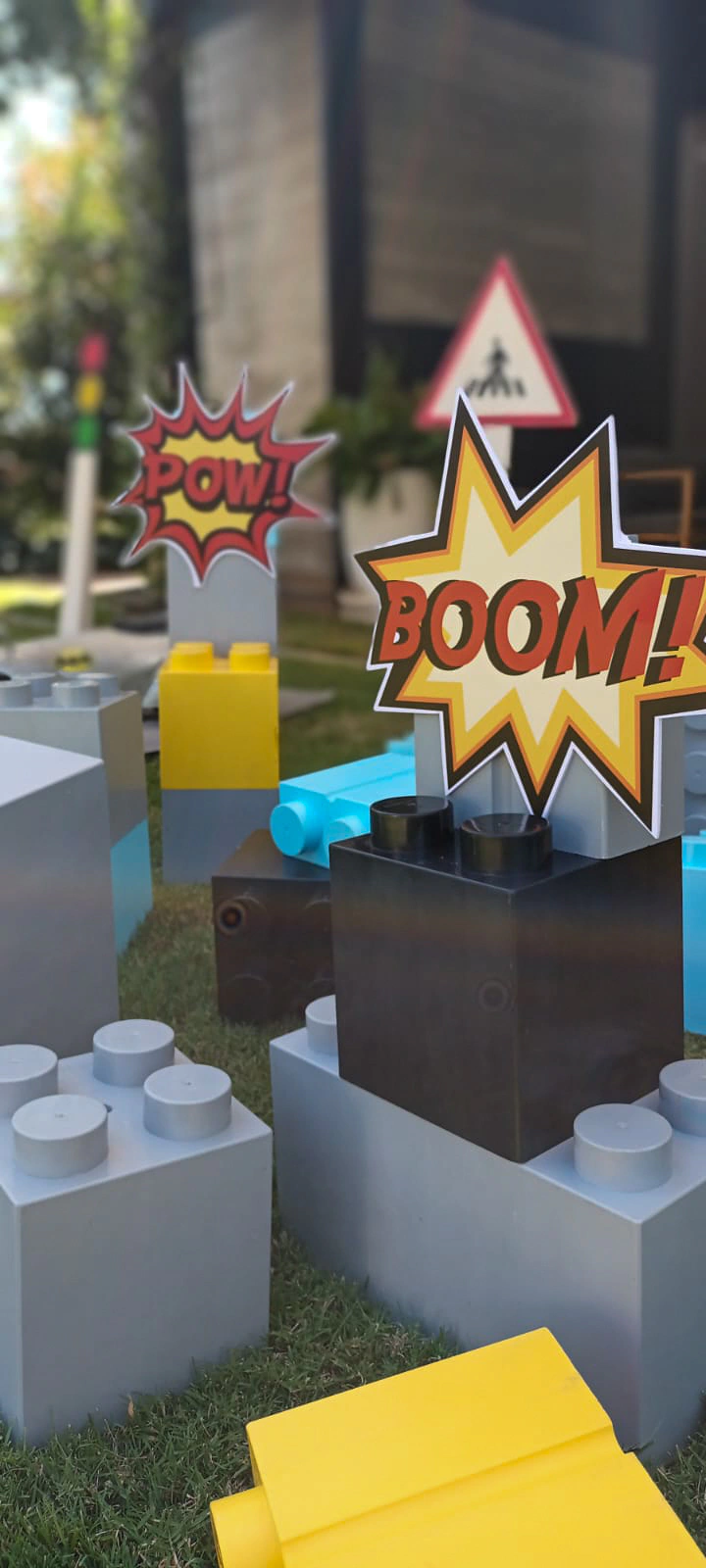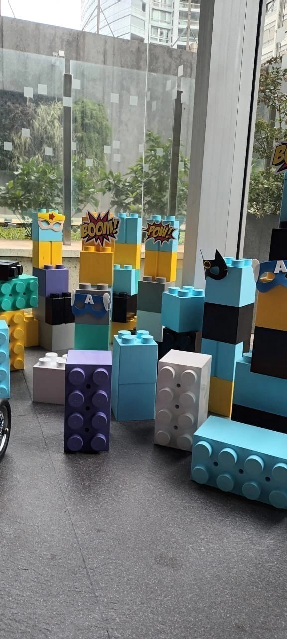 Bloques lego gigantes multicolor con carteles tipo cómic